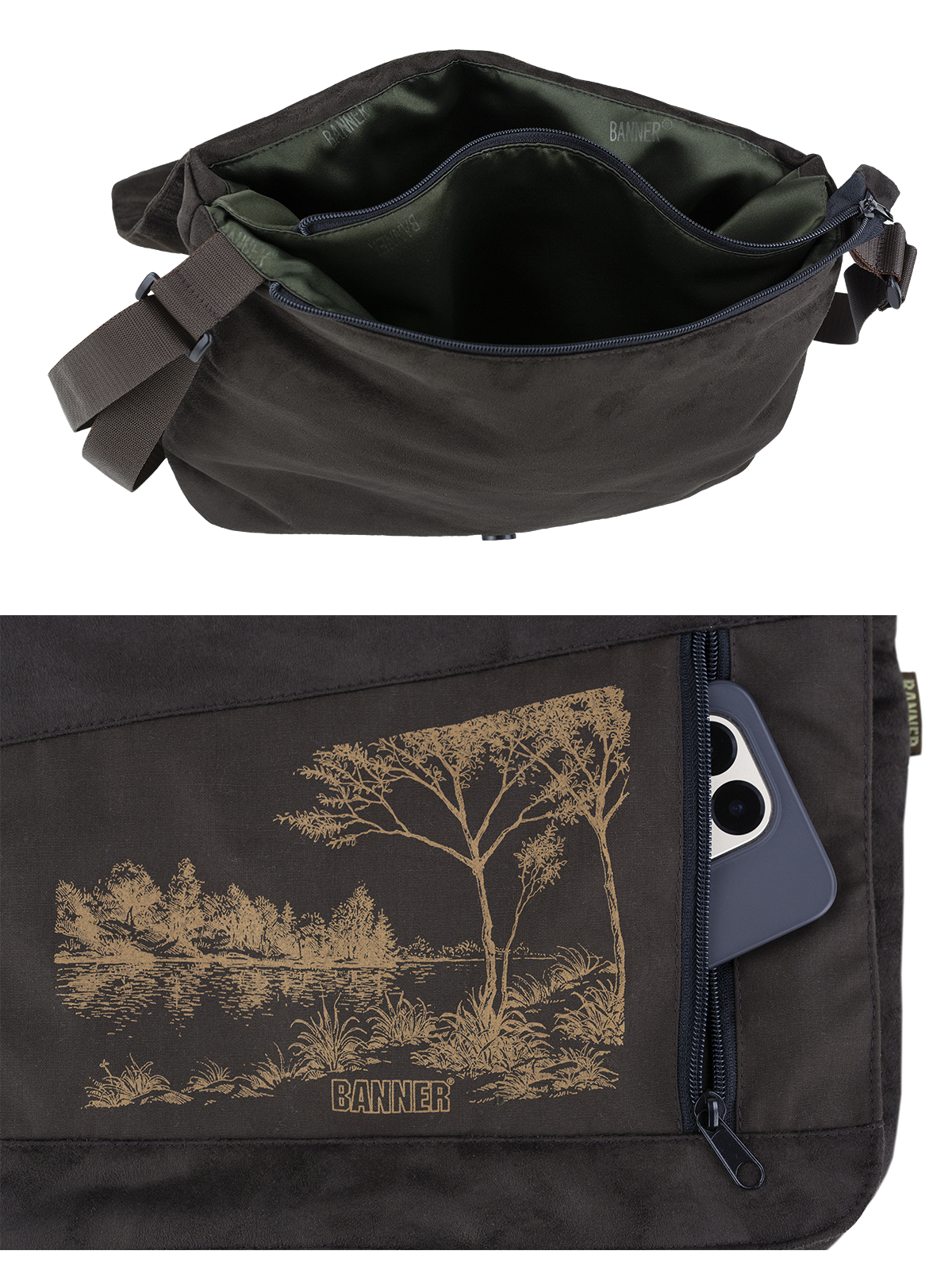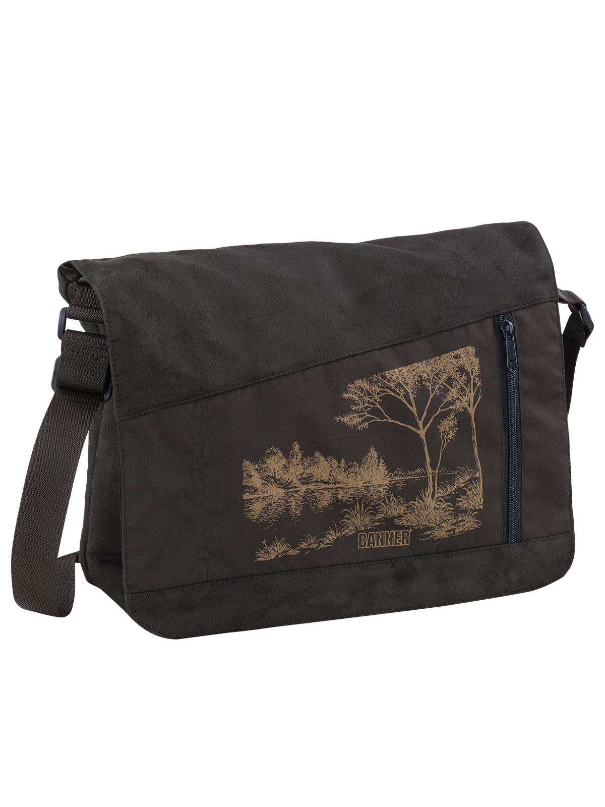 Moderní taška přes rameno v kombinaci tmavě hnědé barvy s tématickým potiskem. Taška je tvořena jednou hlavní kapsou a jednou užší se zipem. V přední, odklápěcí části je menší svislá kapsa (délka zipu 15 cm). Nastavitelný popruh v šířce 3 cm. Rozměry cca: šířka 31 cm, výška 25 cm, hloubka 7 cm.