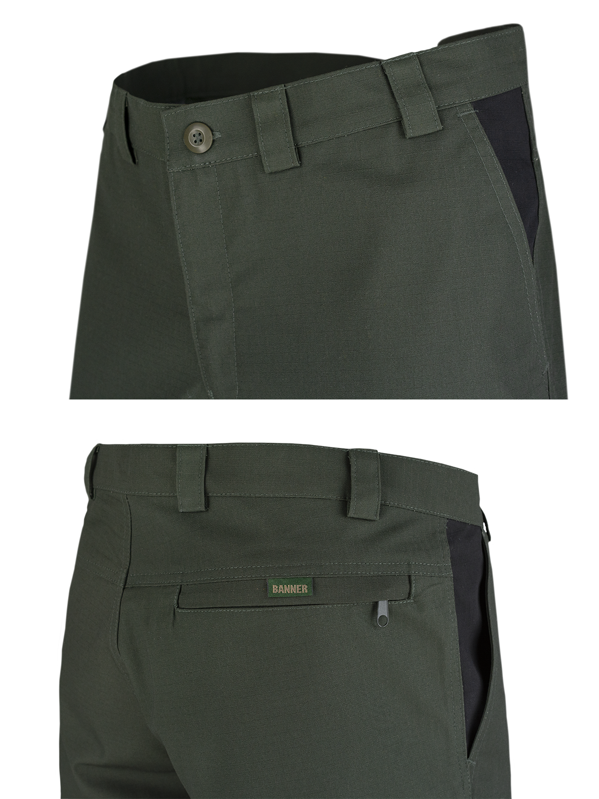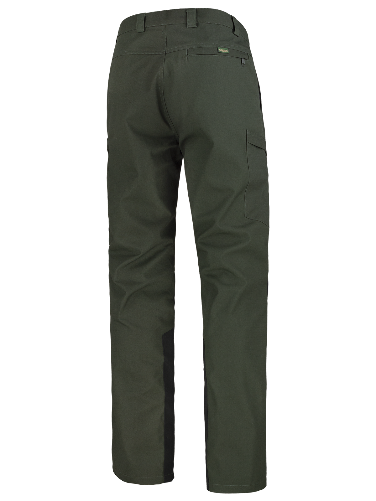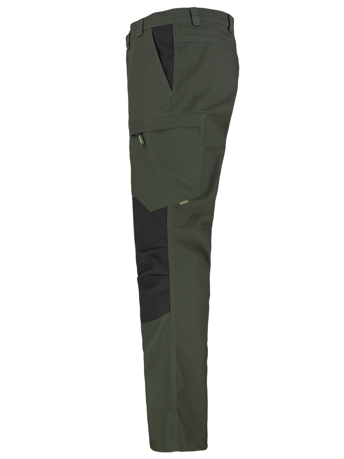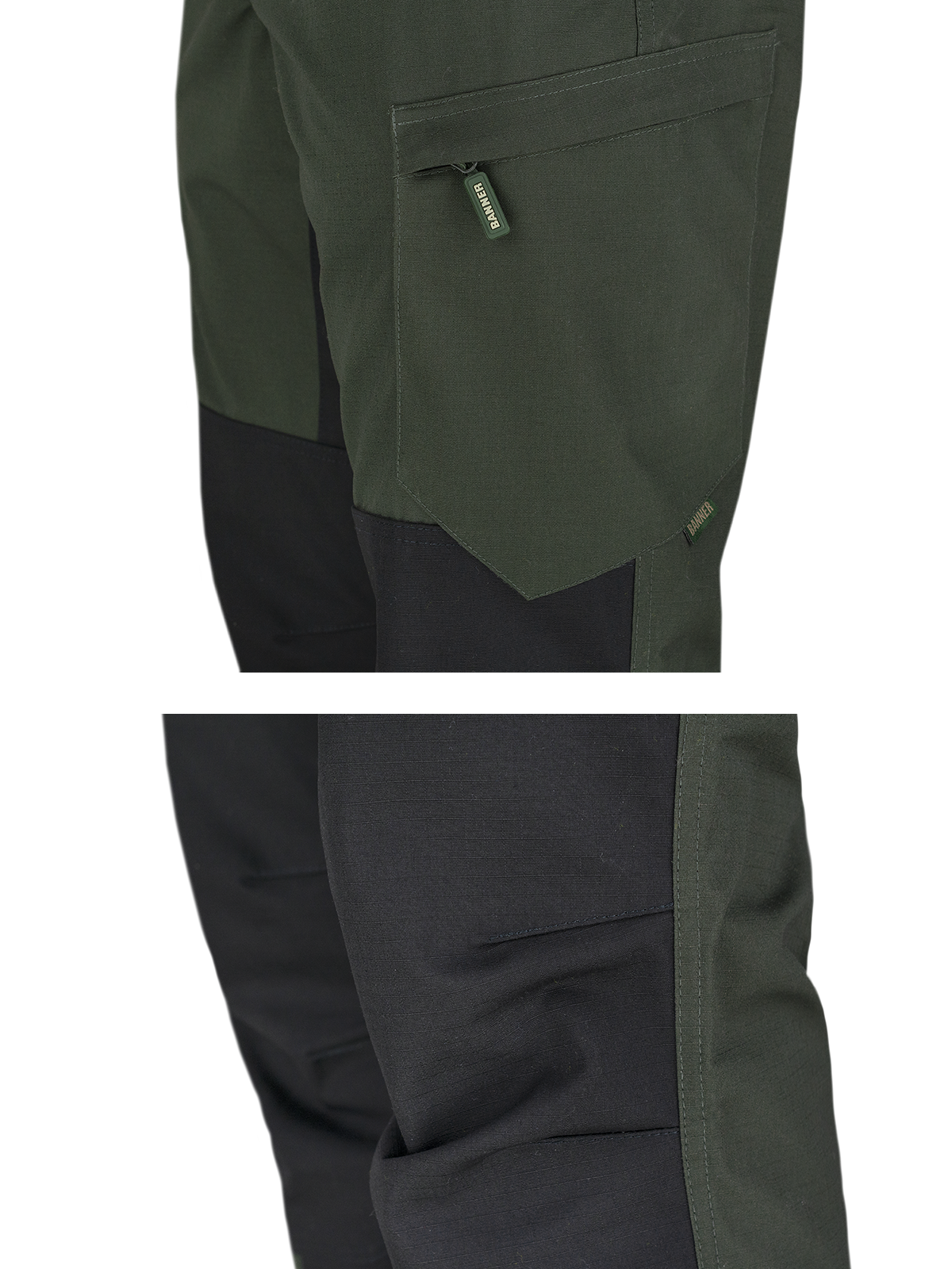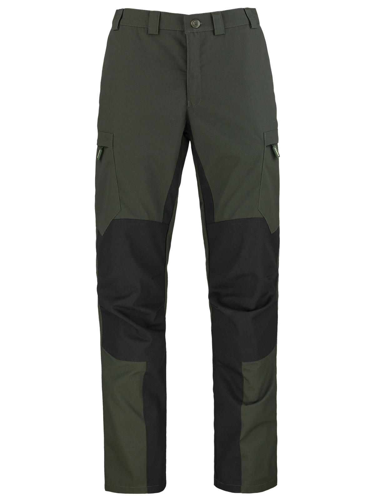 Odolné ripstopové kalhoty outdoorového stylu pro použití v náročném terénu určené pro celoroční použití na trekking, bushcraft, turistiku i pro volný čas. Odolná a lehká tkanina Ripstop se zvýšenou odolností proti oděru a roztržení. Anatomický pohodlný střih. Zpevněná kolena. Prostorné kapsy na stehnech. Barevná kombinace zelené a černé tkaniny.
