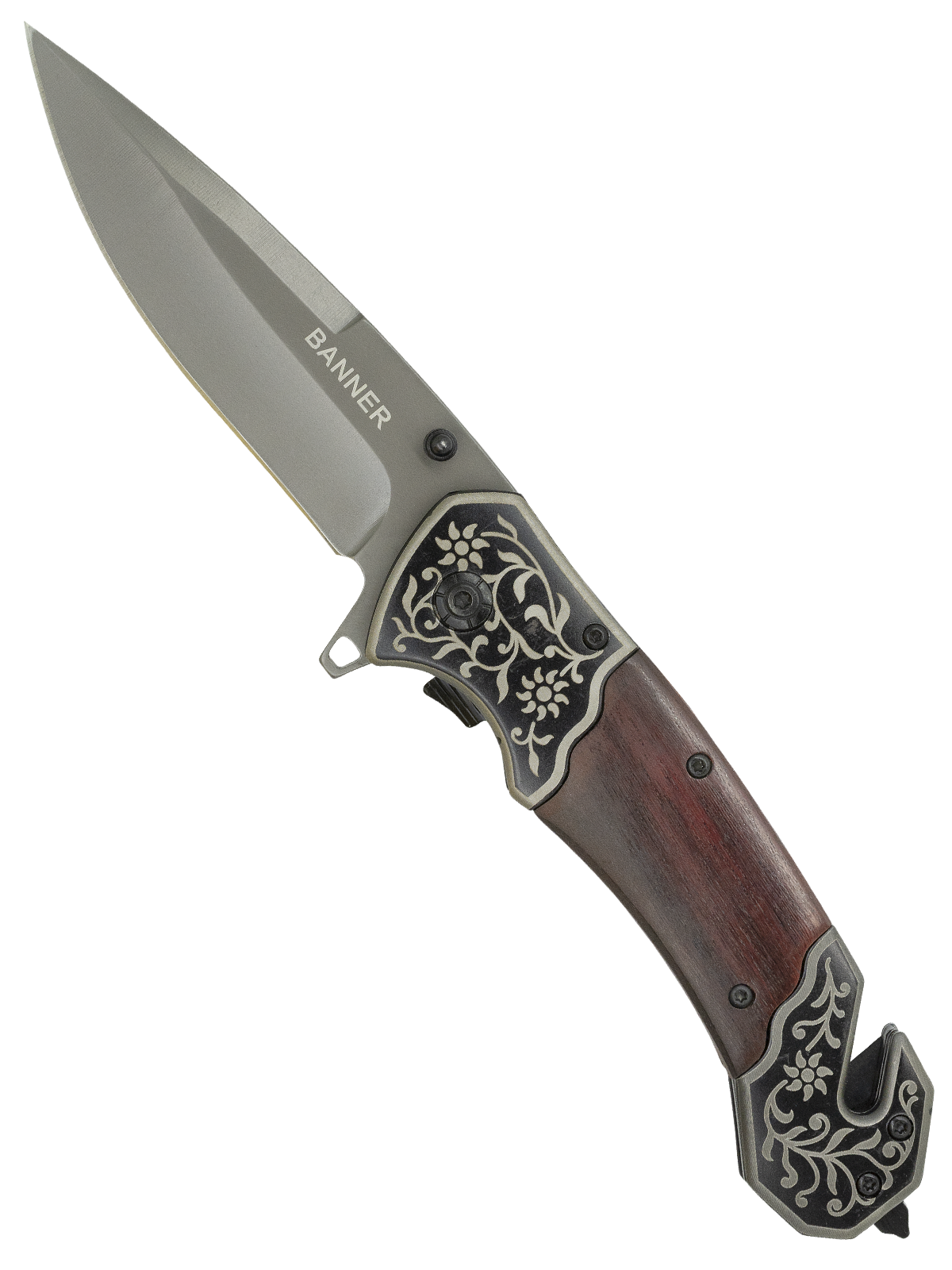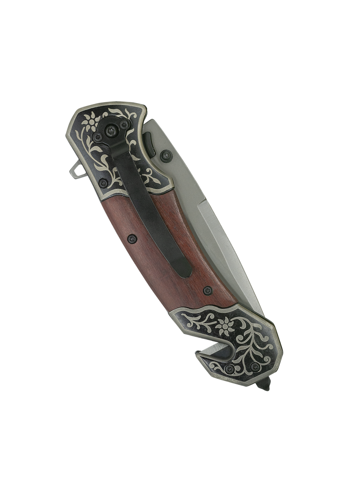 Zdobený zavírací nůž se střenkou v kombinaci dřeva a kovu. Čepel o délce 9,5 cm pro rekreační použití. Řezač popruhů součástí rukojeti. Hrot pro snadné rozbití skla v nouzi na zadní straně rukojeti. Pojistka proti náhodnému zavření a otevření. Lze otevřít jednou rukou. Celková délka otevřeného nože: 23 cm. Kovová spona k zavěšení nože.