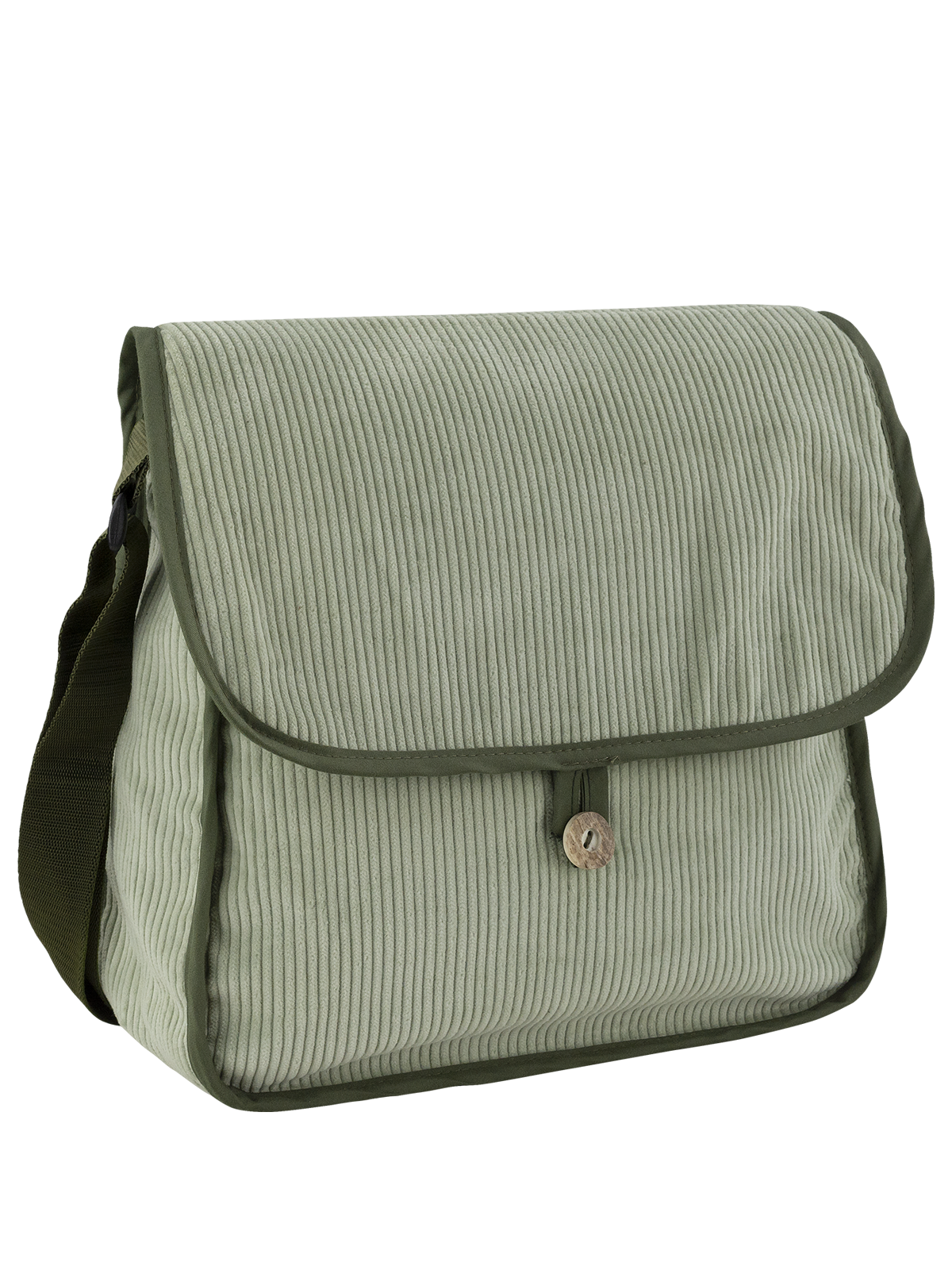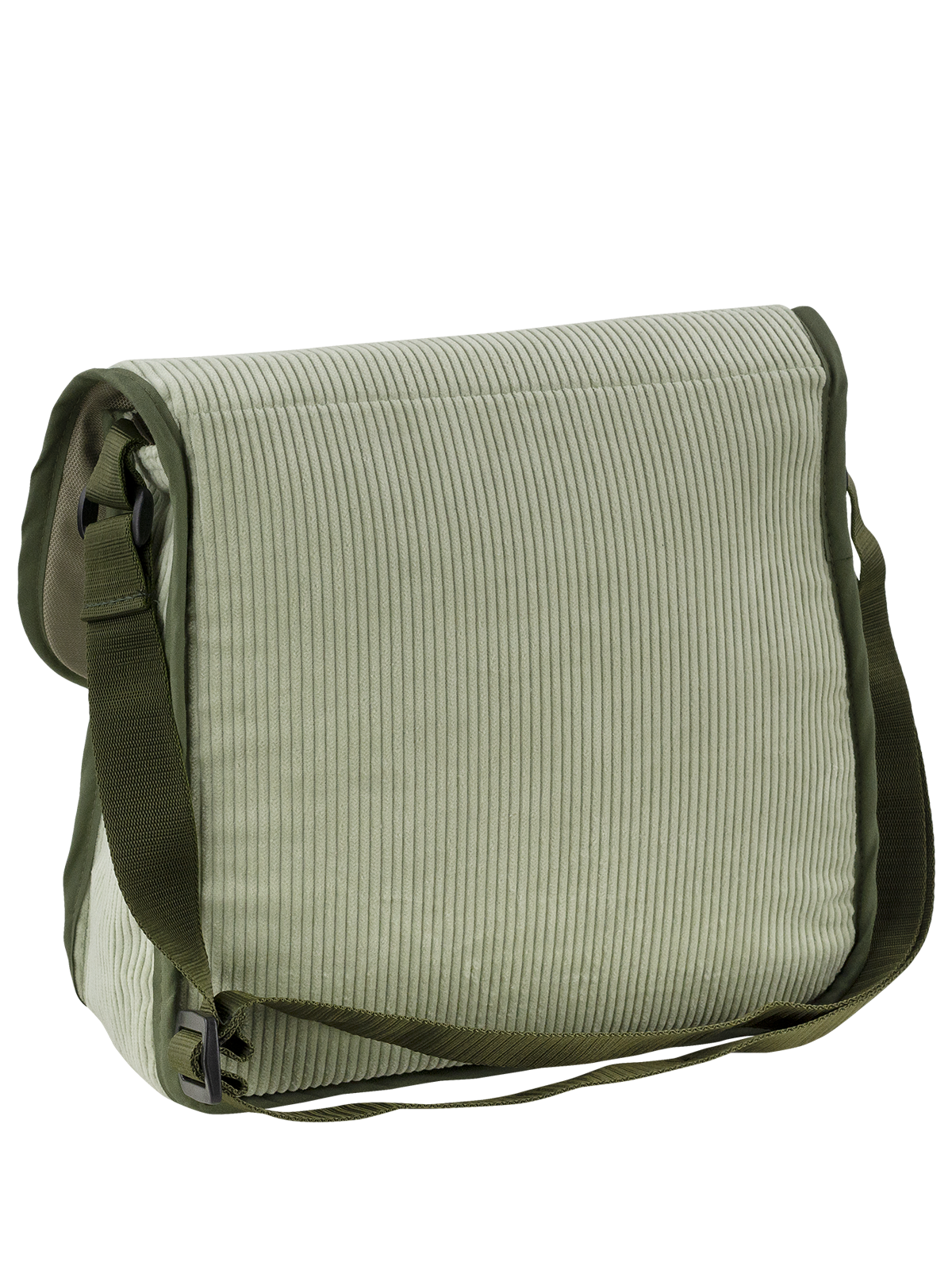 Taška přes rameno ze světlého manšestru se zeleným lemováním. Taška je tvořena hlavní komorou, která je z jedné strany doplněna zipovou kapsou (šíře cca 15 cm) a z protější strany otevřenými kapsami (v šířce 6 a 10 cm). Nastavitelný popruh šíře 3 cm. Rozměry tašky cca: šířka 27 cm, výška 25 cm, hloubka 6 cm.