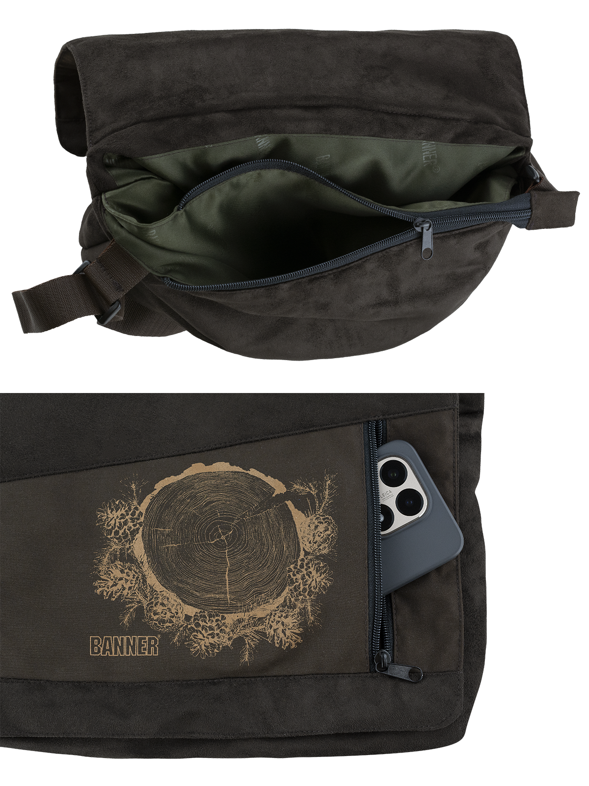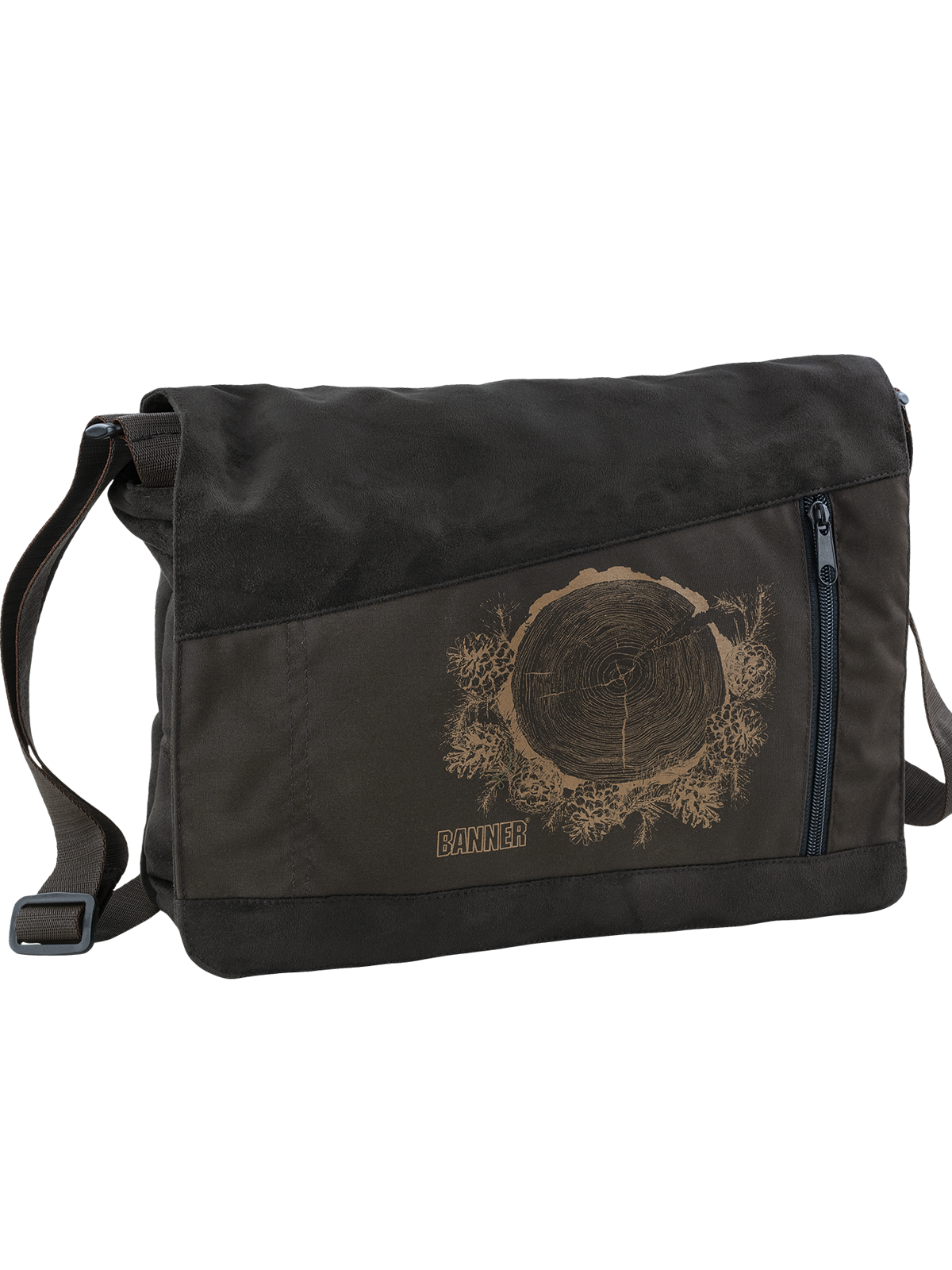 Moderní taška přes rameno v kombinaci tmavě zelené a černé s tématickým potiskem. Taška je tvořena jednou hlavní kapsou a jednou užší se zipem. V přední, odklápěcí části je menší svislá kapsa (délka zipu 15 cm). Nastavitelný popruh v šířce 3 cm. Rozměry cca: šířka 31 cm, výška 25 cm, hloubka 7 cm.