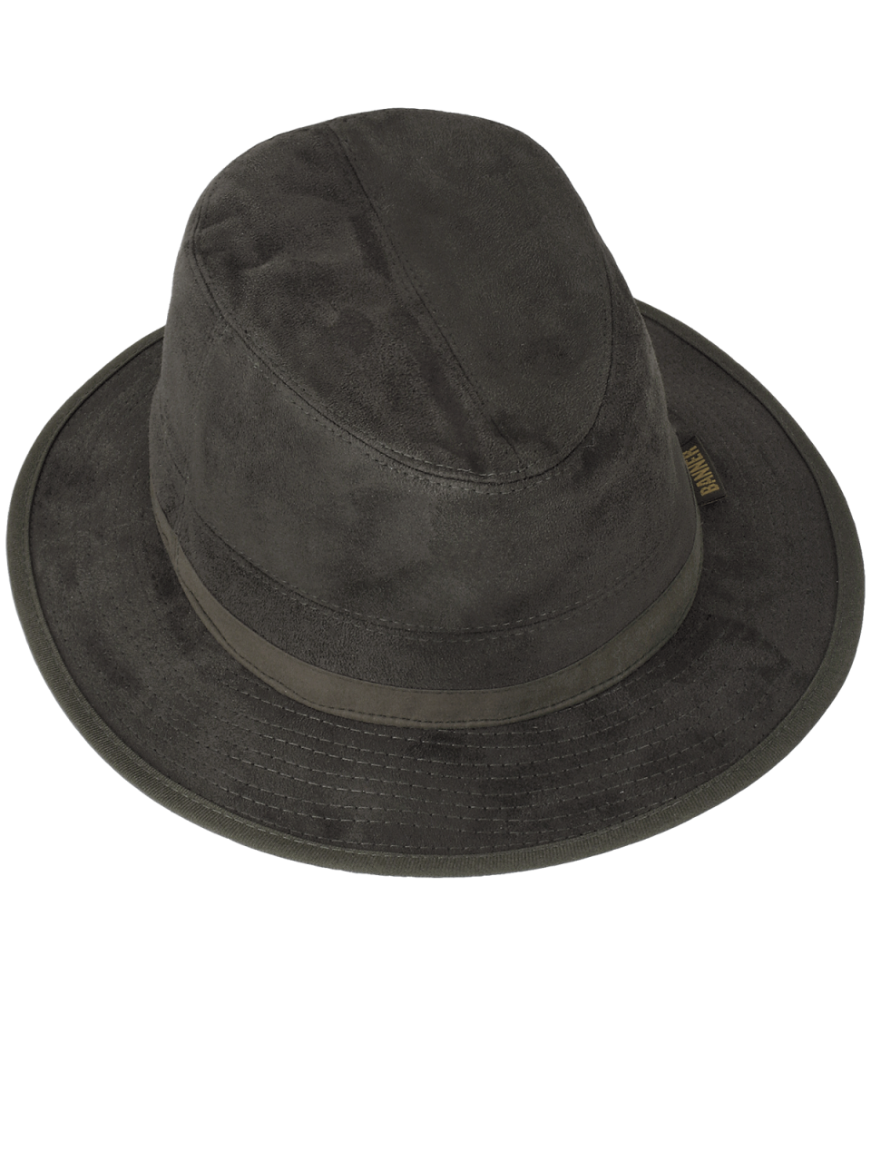 Tmavě hnědý elegantní klobouk s podšívkou vybavený klima-membránou. Klobouk má širokou prošívanou střechu a ozdobný pruh kolem těla klobouku.